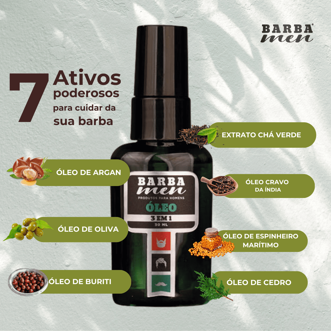 O ÓLEO PARA BARBA - 3 EM 1 - BARBA MEN - é considerado um dos melhores óleos para Barba e Bigode do mercado, desenvolvido pela BARBA MEN, com um aroma exclusivo, matérias primas importadas e princípios ativos naturais altamente tecnológicos, incluindo NANOTECNOLOGIA. Ele promove maciez, hidratação, brilho, proteção e disciplina, além de eliminar o frizz e as pontas duplas.